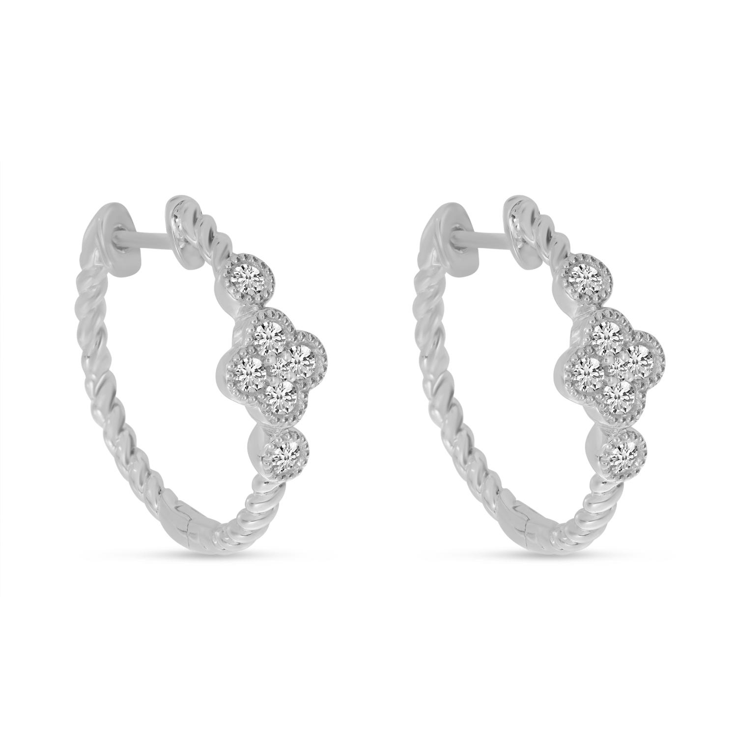14K White Gold Diamond Clover Twist Hoop Earrings