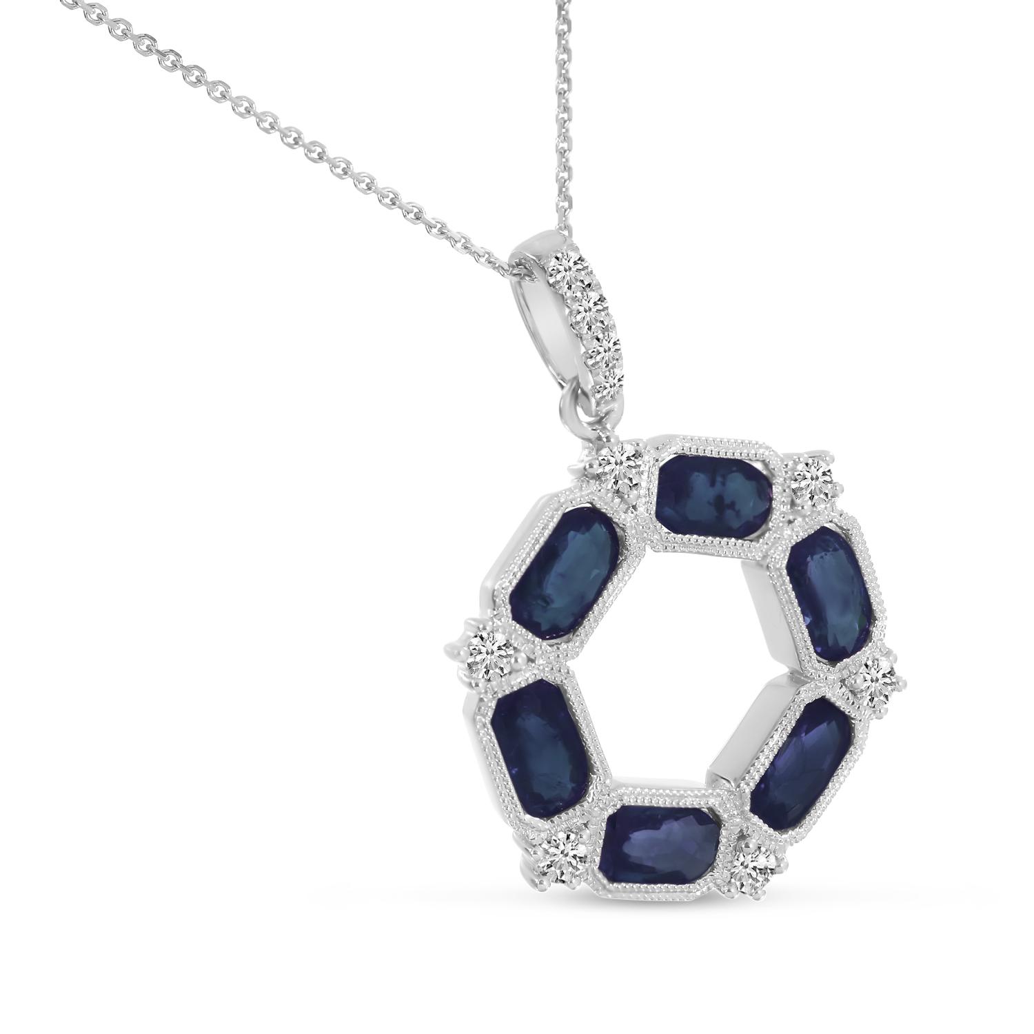 14K White Gold Oval Sapphire and Diamond Hexagon Circle Pendant
