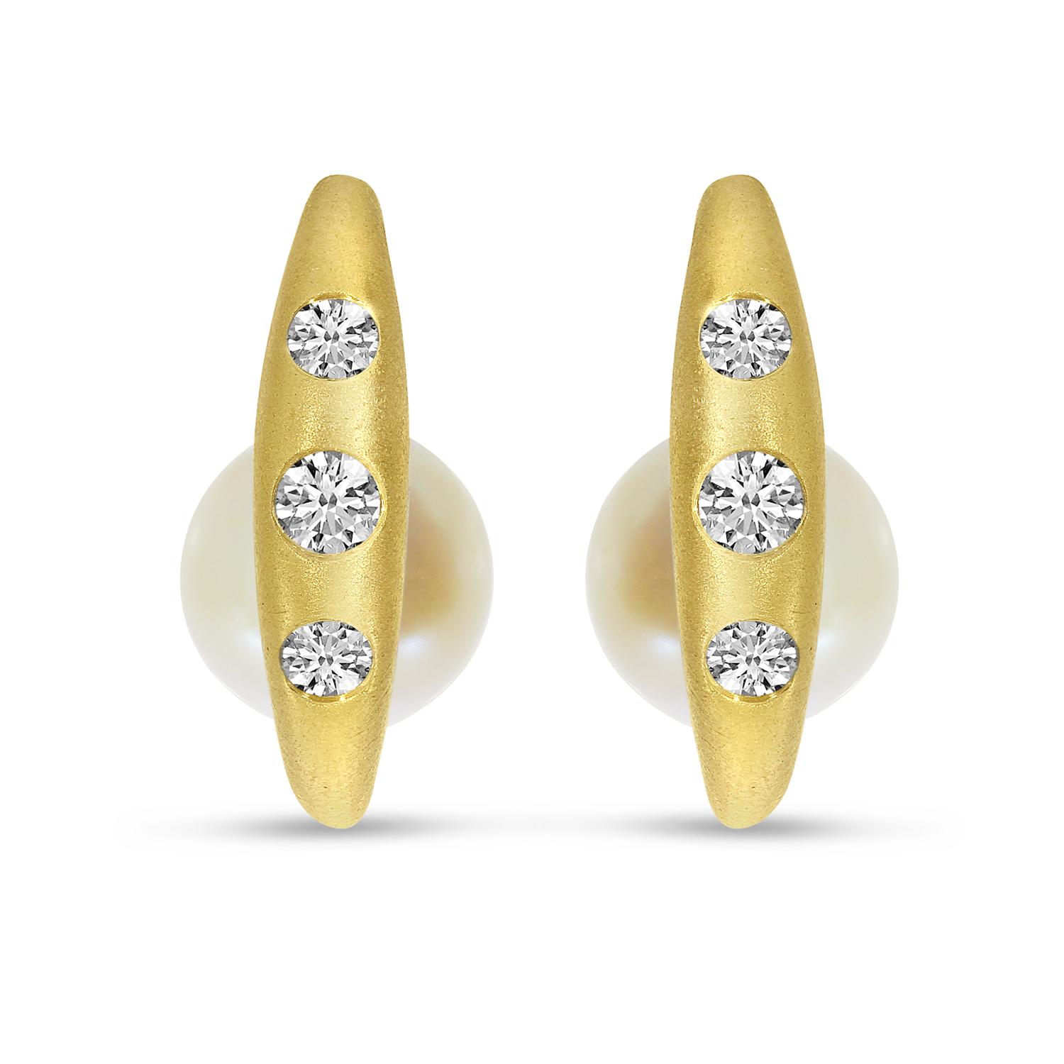 14K Yellow Gold Brushed Diamond and Pearl Huggie Earrings