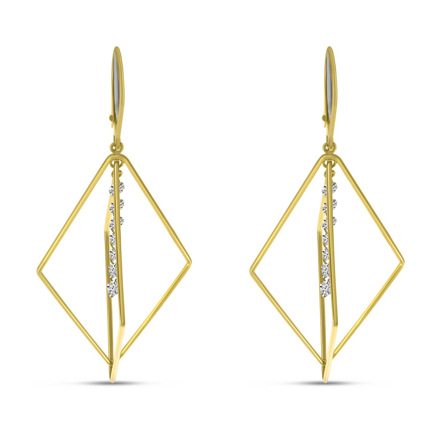 14kt yellow gold Dashing Diamond 3D geometric triangle earrings. Light weight and comfortable on the ear, with so much movement these are certain to become a favorite!