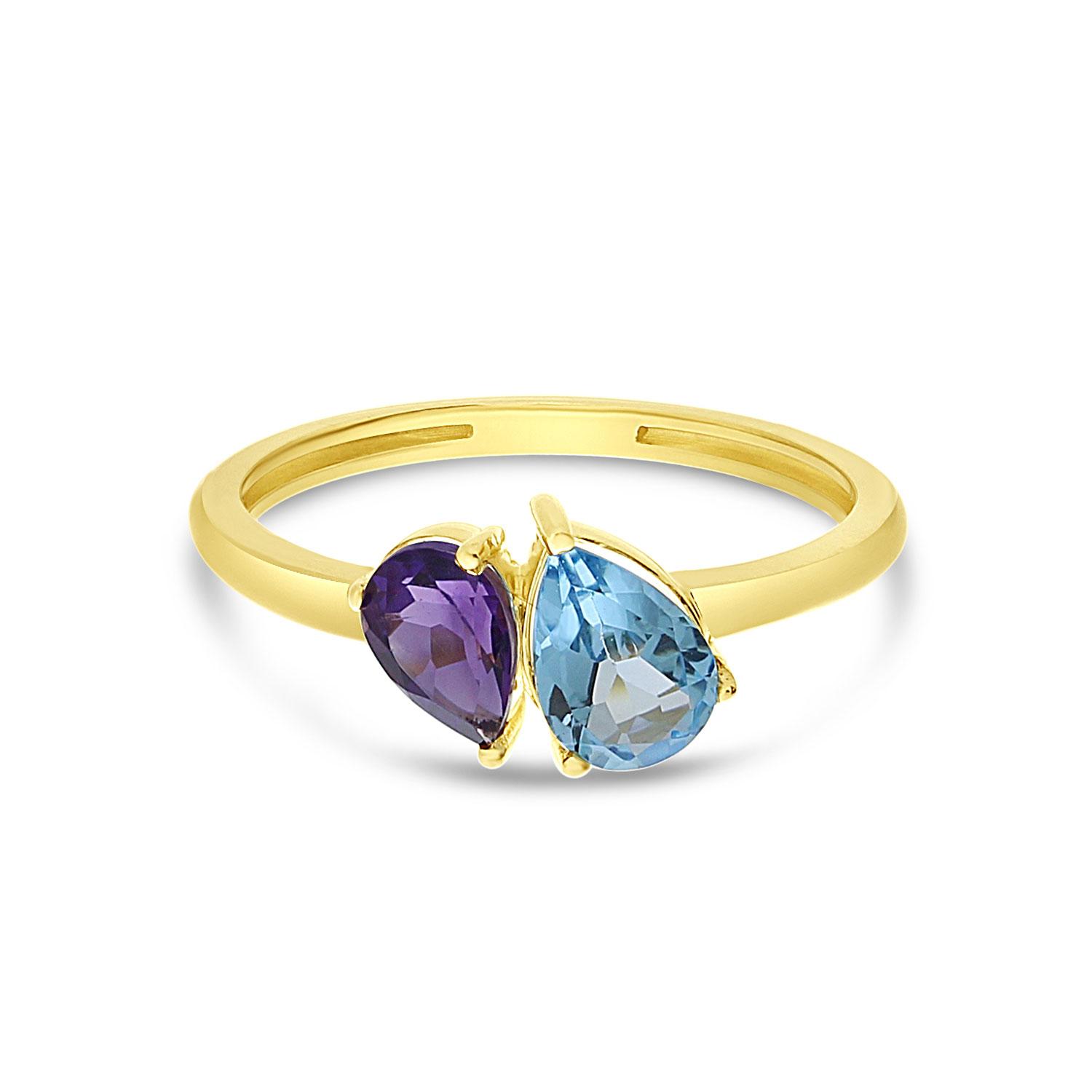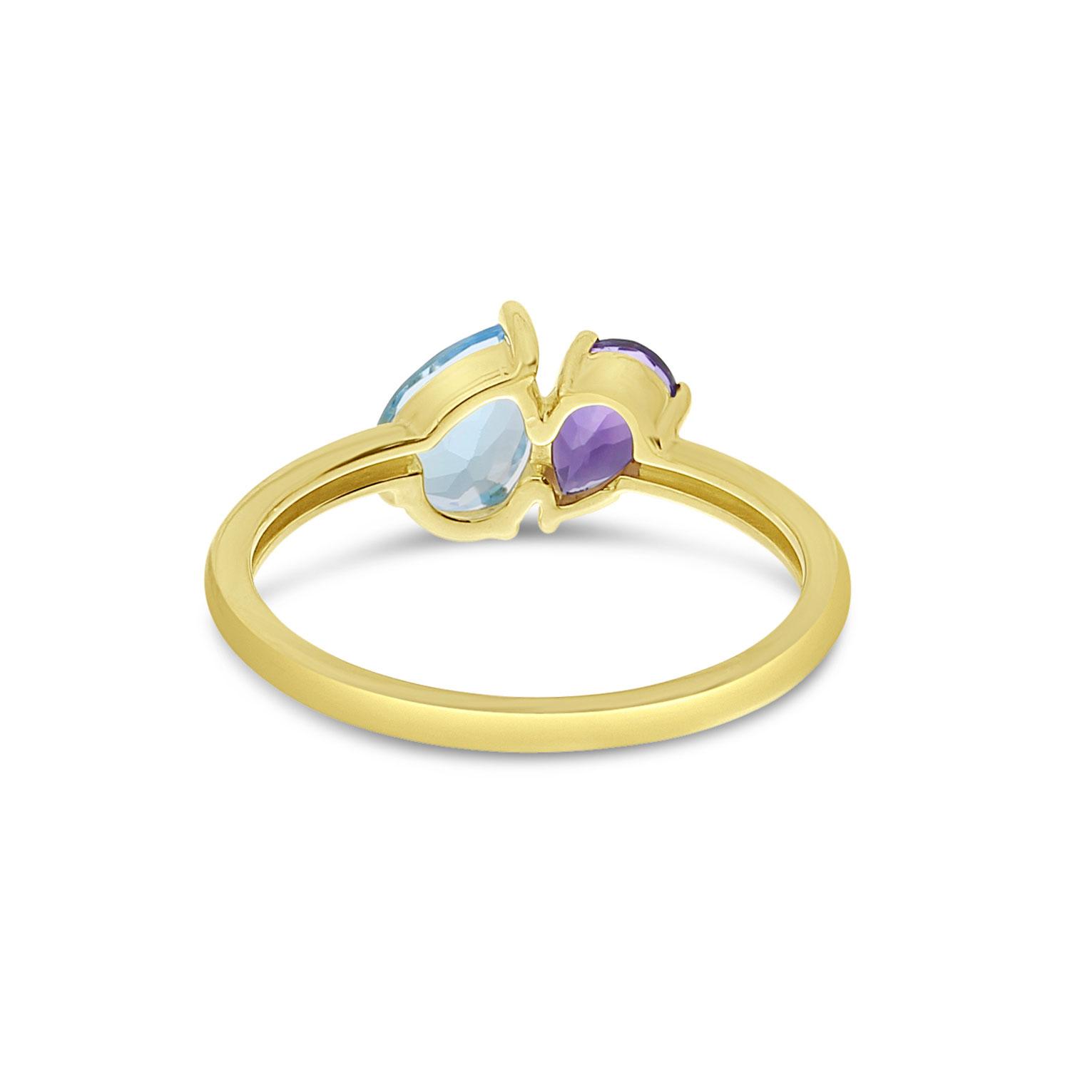 14K Yellow Gold Double Pear Amethyst and Blue Topaz Duo Ring