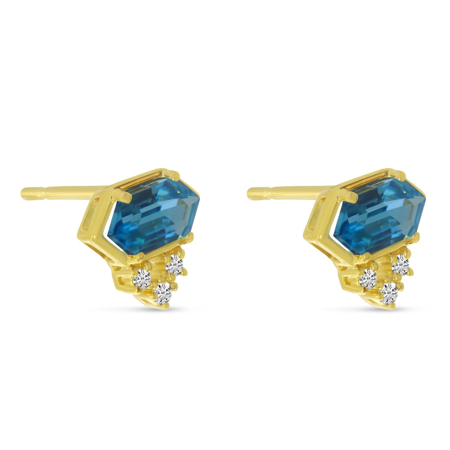 14K Yellow Gold Hexagon Blue Topaz and Diamond Stud Earrings