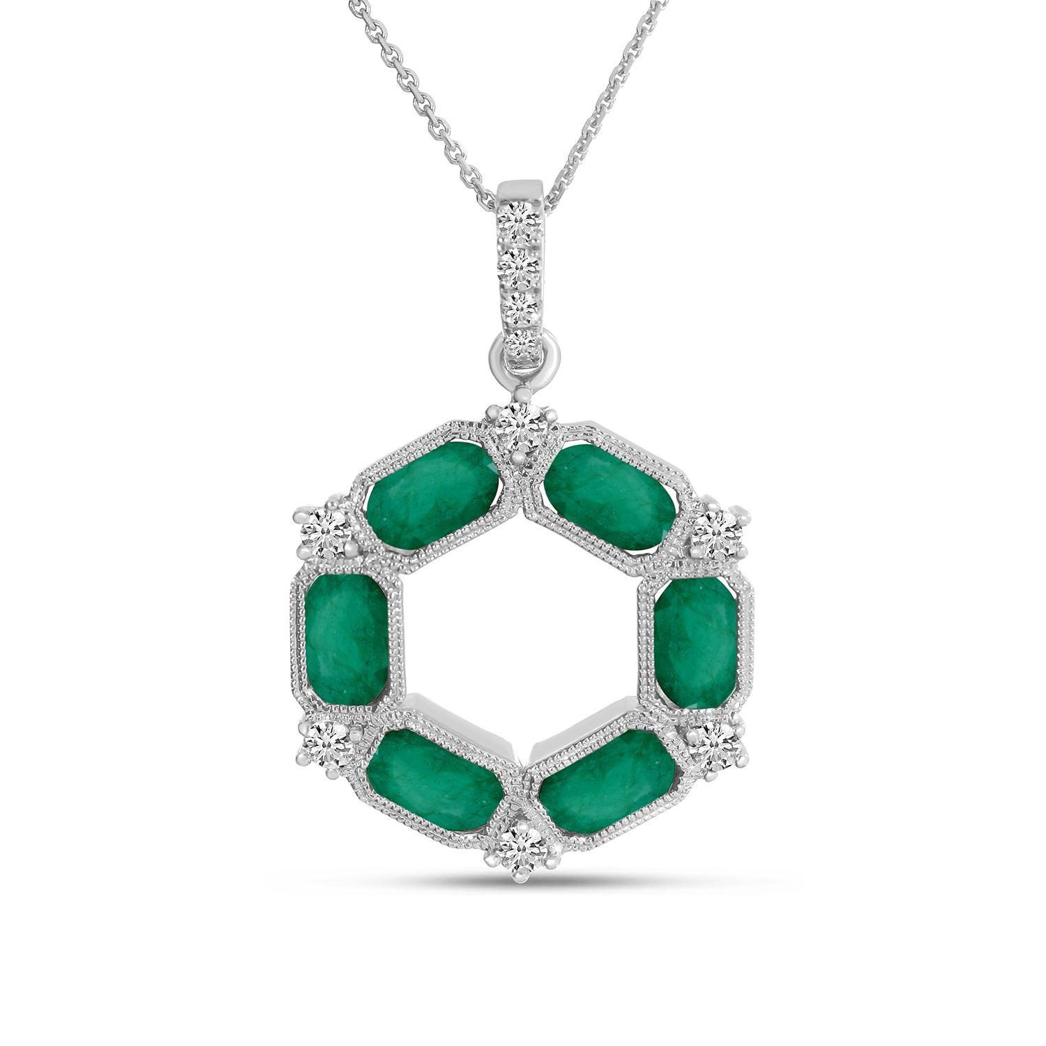 14K Yellow Gold Oval Emerald and Diamond Hexagon Circle Pendant