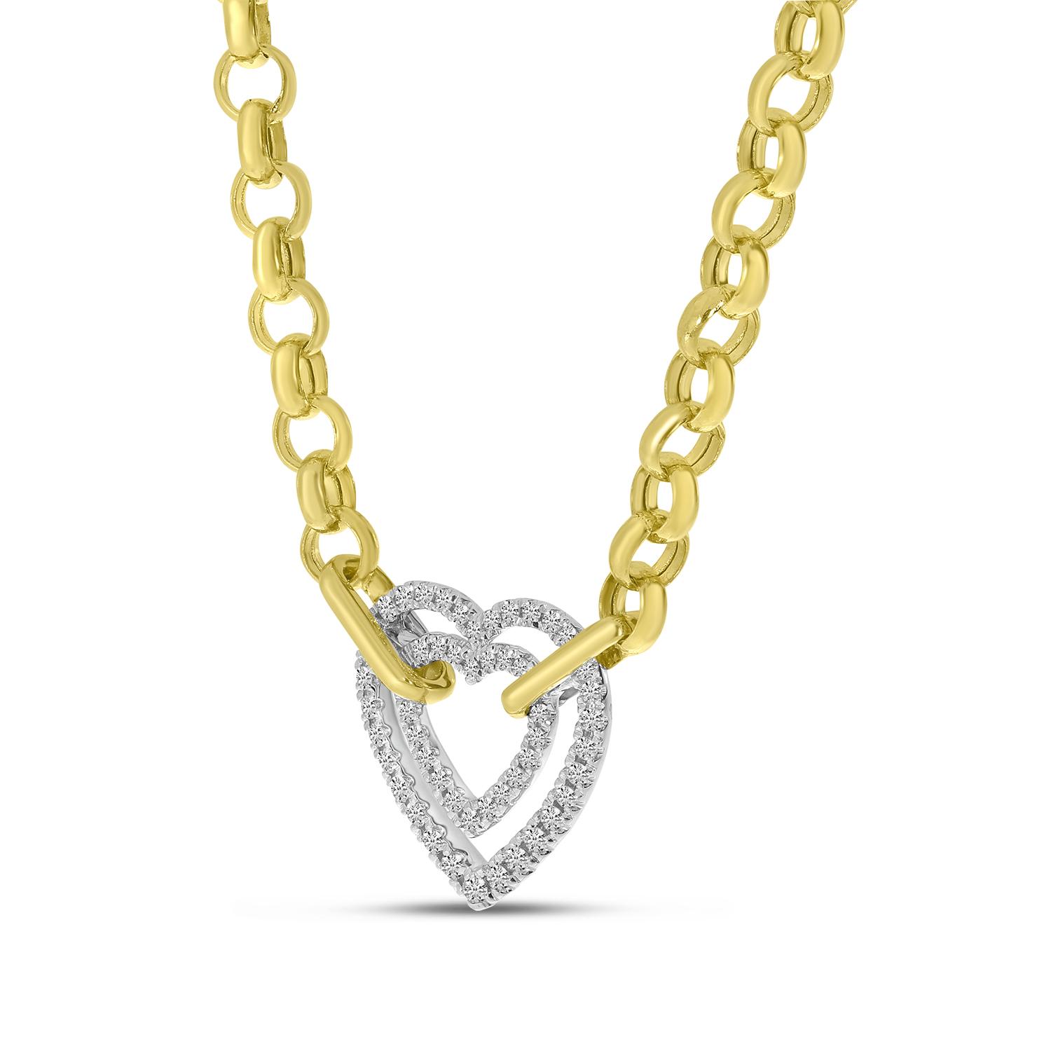 14K Two Tone Gold Double Diamond Heart on Heavy Yellow Gold Rolo Chain 18 in Necklace