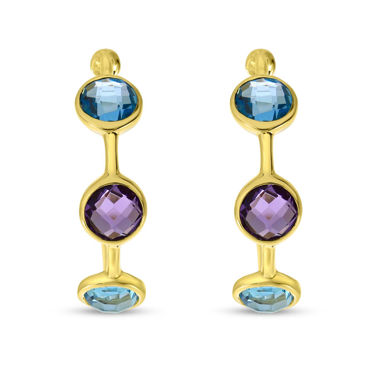 14K Yellow Gold Amethyst and Blue Topaz Triple Bezel Hoop Semi Precious Earrings