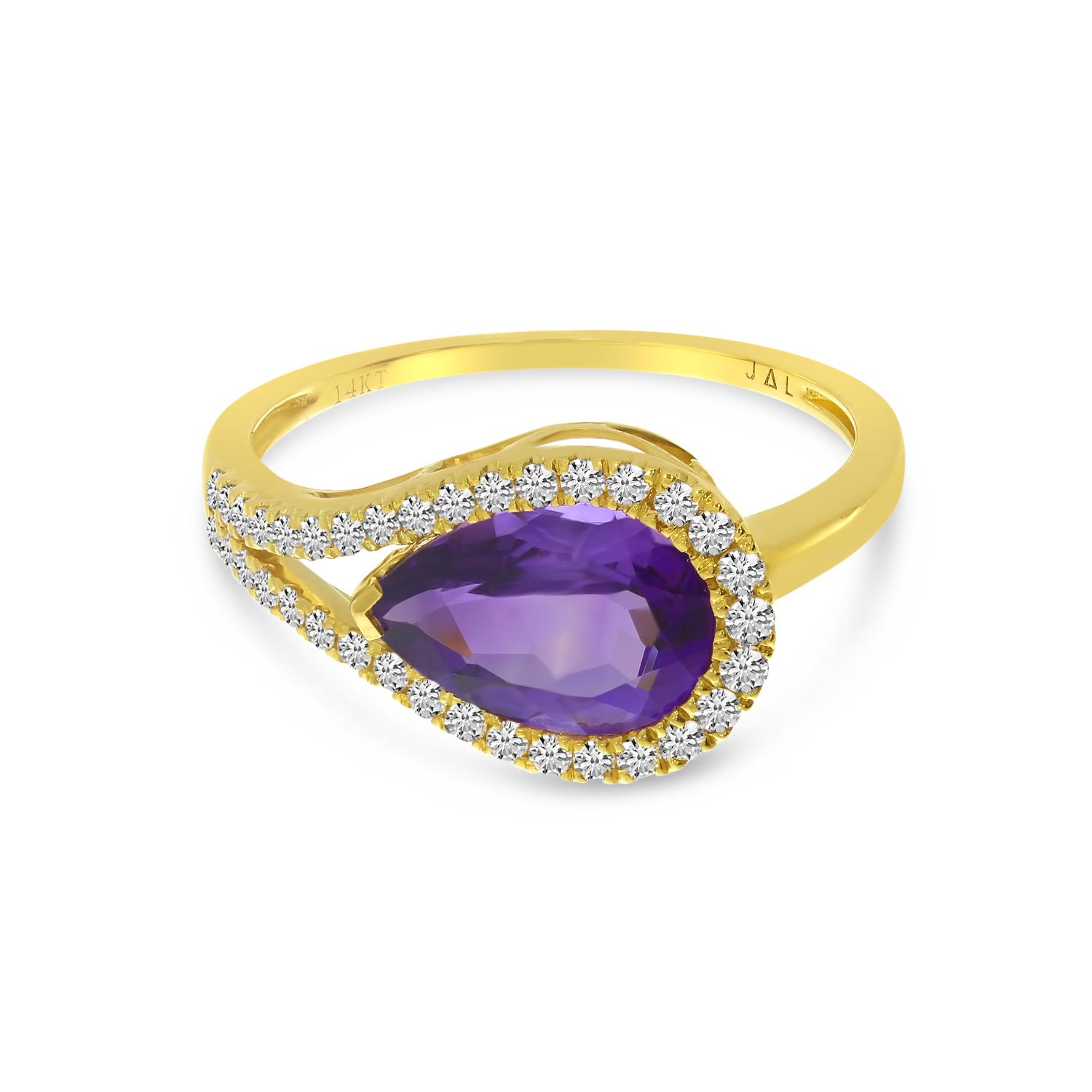 14K Yellow Gold Amethyst East to West Pear Cut Diamond Halo Amethyst Ring