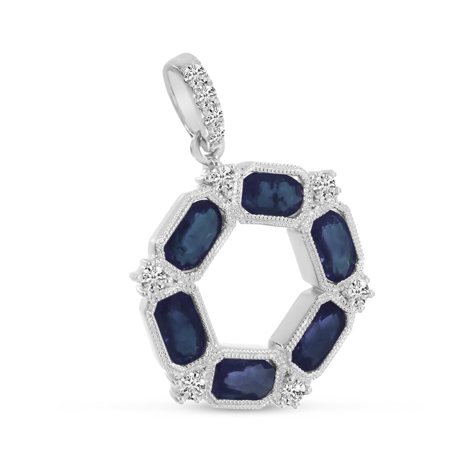 14K White Gold Oval Sapphire and Diamond Hexagon Circle Pendant