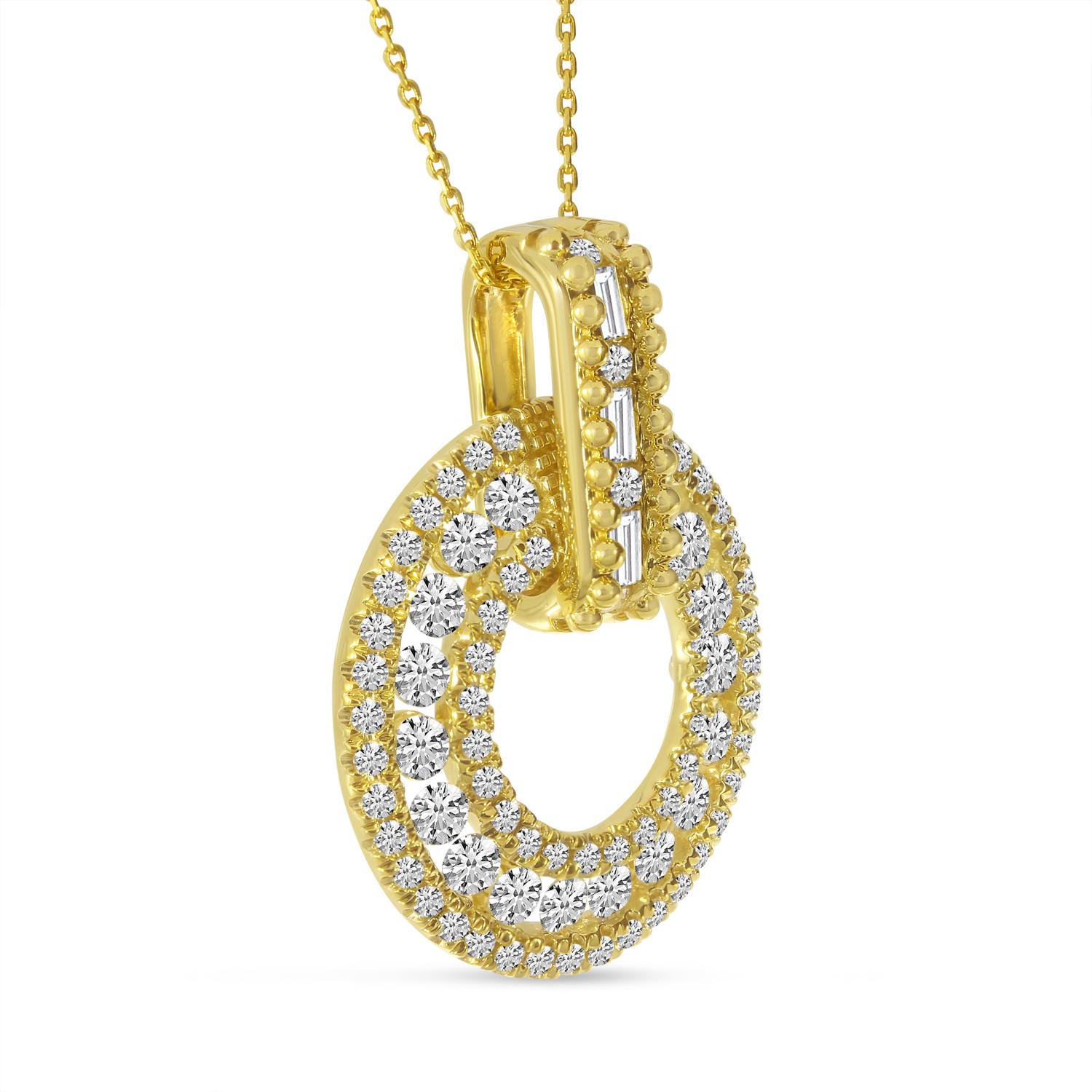 14K Yellow Gold 1.43 ct Diamond Circle Pendant with Beaded Bale and Baguette Diamonds