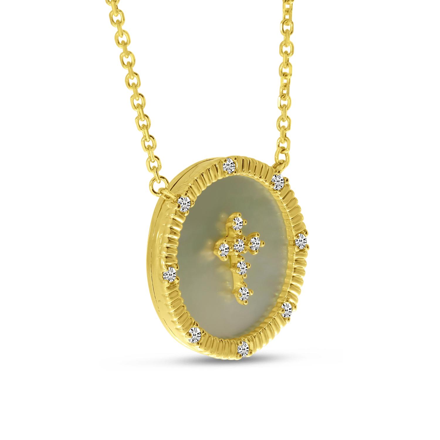 14K Yellow Gold Mother of Pearl Disc with Diamond Cross Cable Chain Necklace