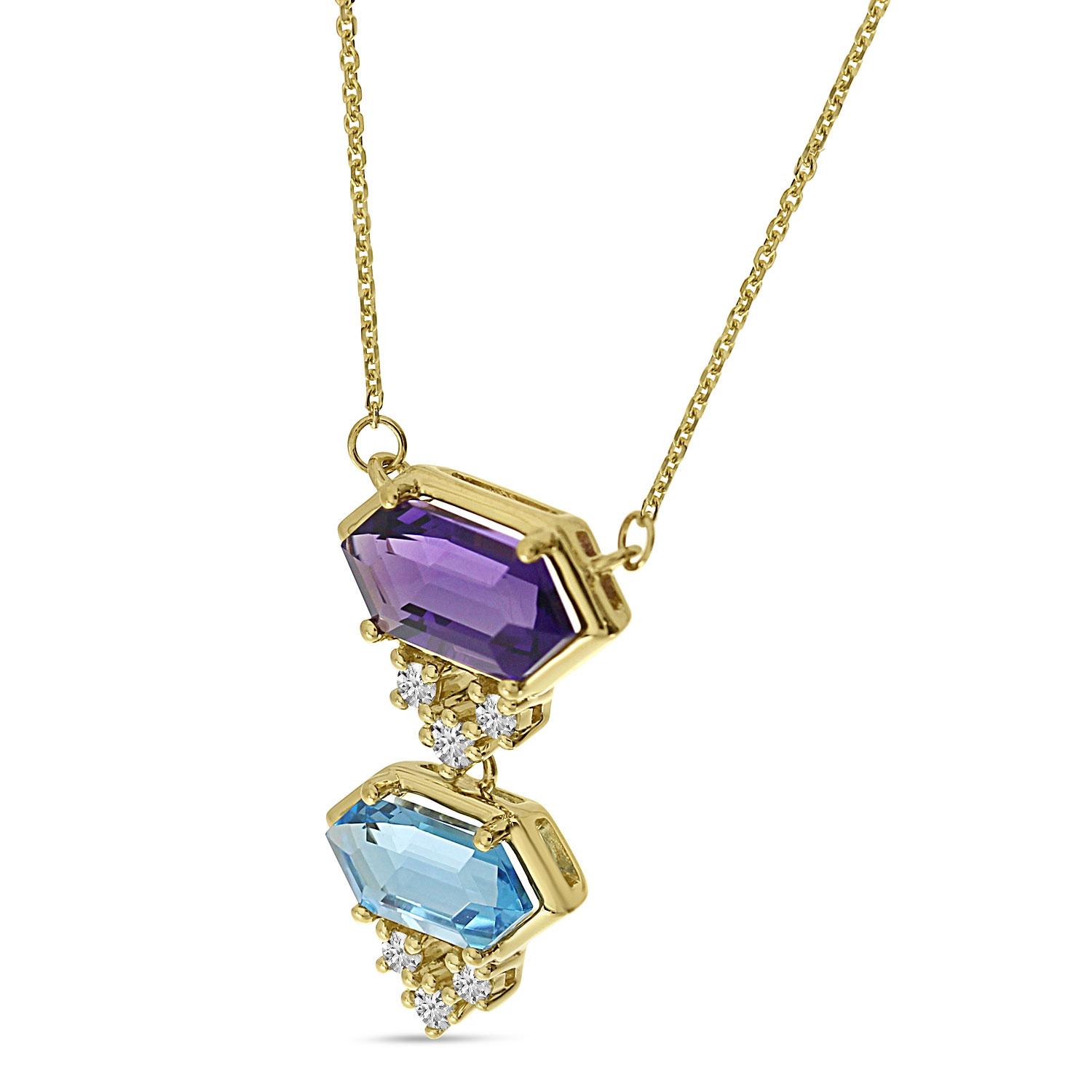 14K Yellow Gold Double Hexagon Amethyst and Blue Topaz with Diamond Semi Precious Necklace