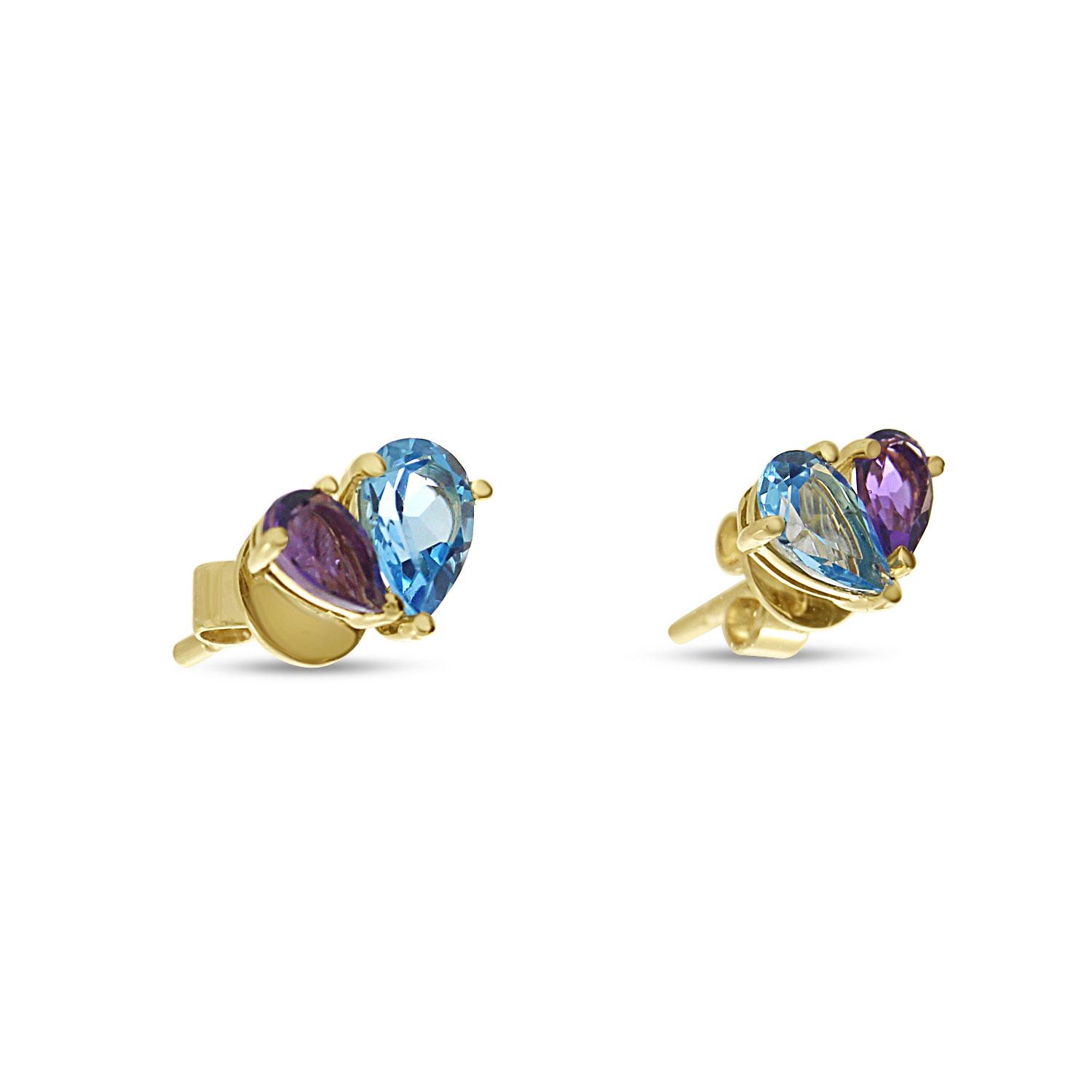 14K Yellow Gold Double Pear Amethyst and Blue Topaz Heart Stud Earrings