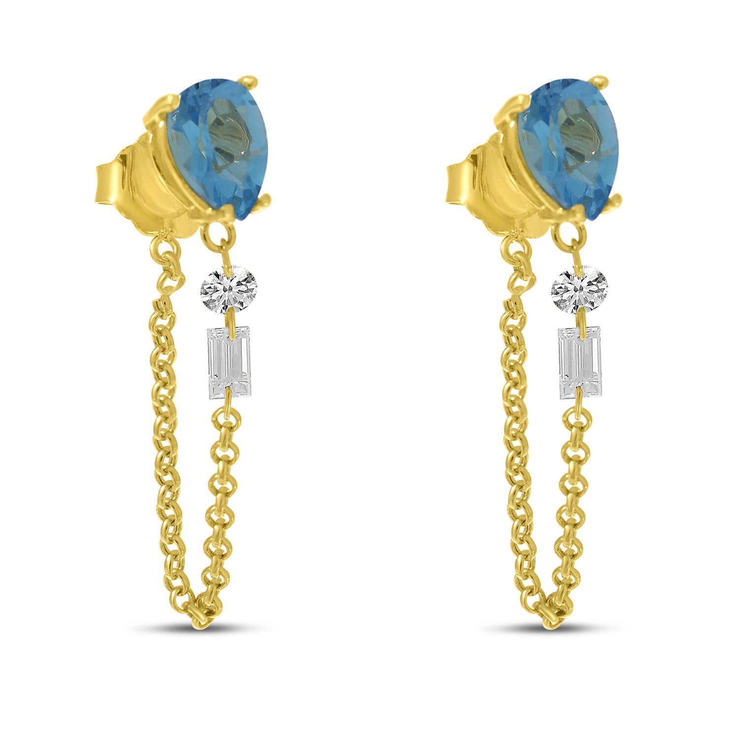 14K Yellow Gold Round and Baguette Dashing Diamonds with Pear Shape Blue Topaz Front/Back Chain Stud Earrings