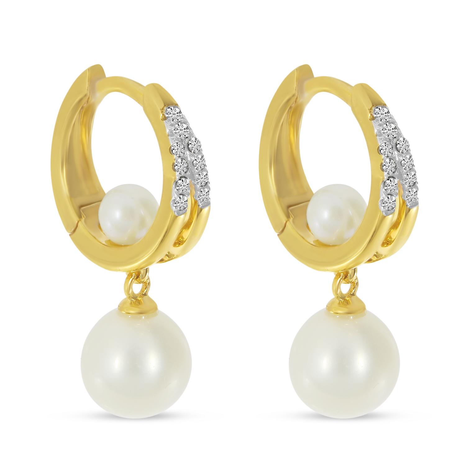 14K Yellow Gold Split Diamond Huggie with Pearl Earrings